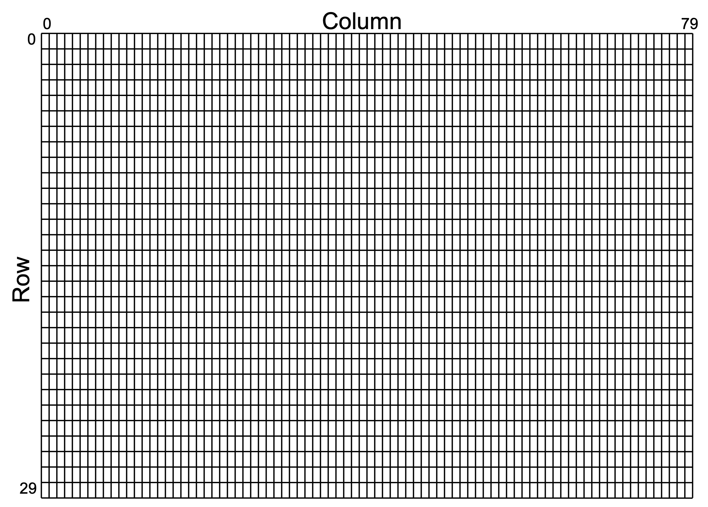 Displaying text is an important function of a video controller. Dedicated circuits are often used to facilitate the display of text characters on a screen. To display text on our VGA display, we will organize the 640x480 display area into larger “tiles” where each tile represents a character location. In this lab, the size of each character is 8 pixels wide and 16 pixels high. Mapped onto a 640x480 display, this font will display 80 text characters in each line (i.e., 640 pixels for each row divided by 8 columns per character) and 30 lines (i.e., 480 lines divided by 16 pixels per character, 480 / 16). The layout of the 80 x 30 character screen is shown below.