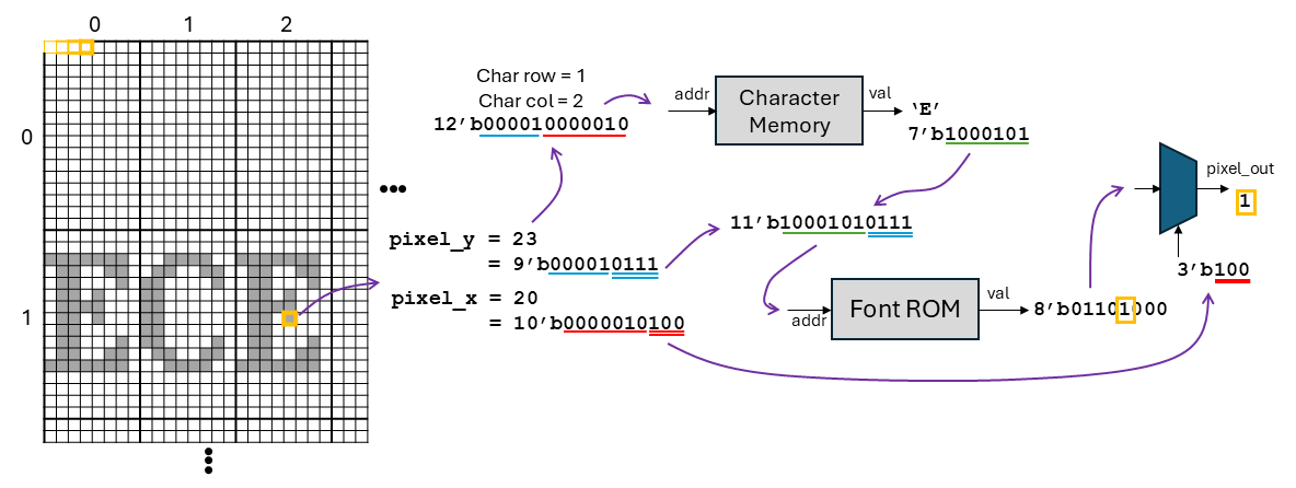 pixel_xandpixel_y) and will determine whether the pixel at that location should be on (i.e., foreground) or off (i.e., background) based on the character memory and the font ROM (it has an instance of the font ROM within it), and outputs a1or0on thepixel_outport.