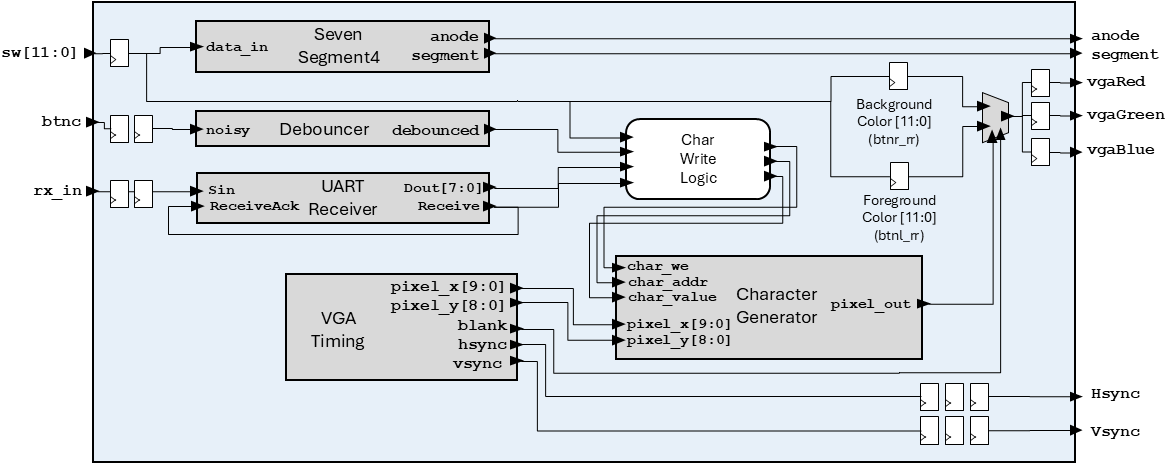 To implement this system, you will create the following top-level design that integrates several of the components you have designed in previous labs, including the VGA timing controller, the UART receiver, and the seven segment display controller.