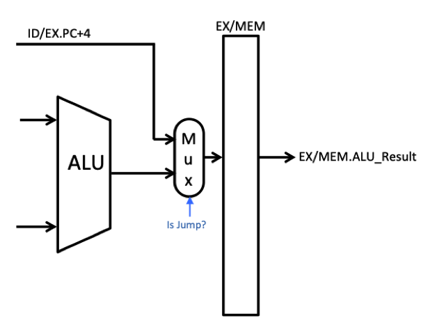 - Add a multiplexer that selects between the output of the ALU and this ex_PC_plus_4 signal. For Jump instructions the multiplexer should select the ex_PC_plus_4. For all other instructions, the multiplexer should select the output of the ALU.