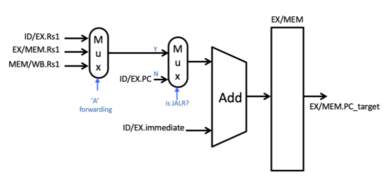 The following figure demonstrates how the dedicated adder used for computing the branch target in the EX stage can be modified to compute the PC target in the EX stage for all three situations. The key modification is the addition of a MUX that chooses between adding the PC (for the branch and JAL instructions) and the value of rs1 (for the JALR instruction). Note that since rs1 is used for the JALR instruction, forwarding logic is needed to forward values in the pipeline to this input.