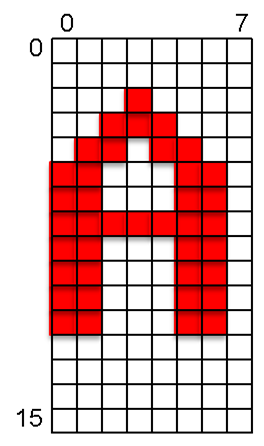 The figure below demonstrates the definition of the character ‘A’ in this font using red pixels for the foreground and white pixels for the background: